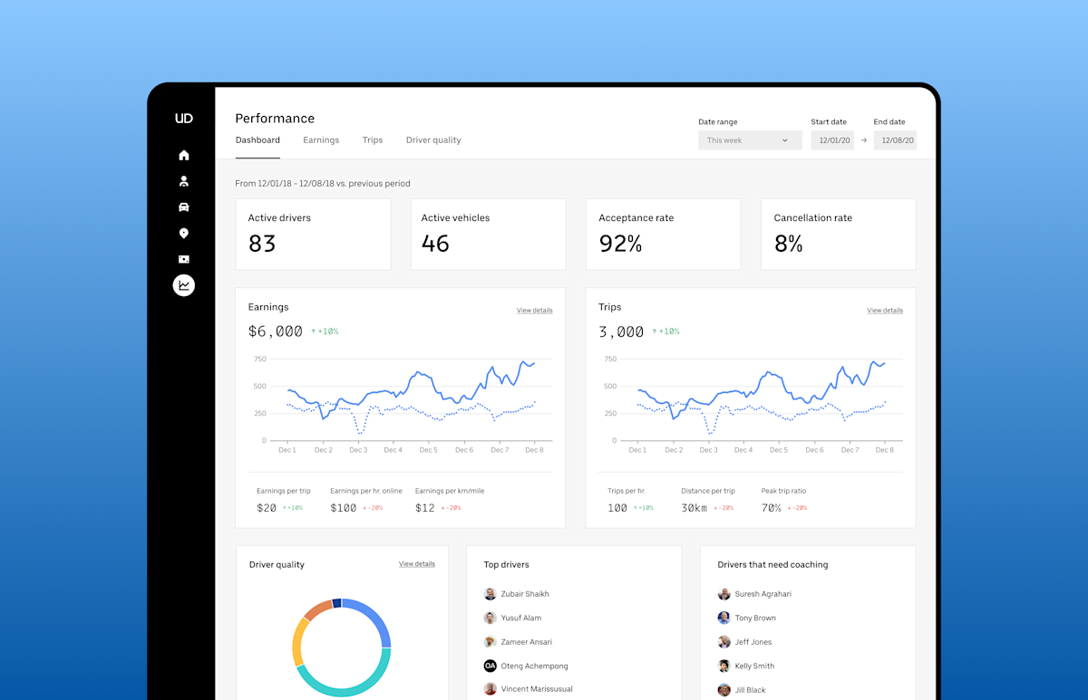 A high-level dashboard with key fleet metrics such as earnings, trips, utilization, and driver quality
